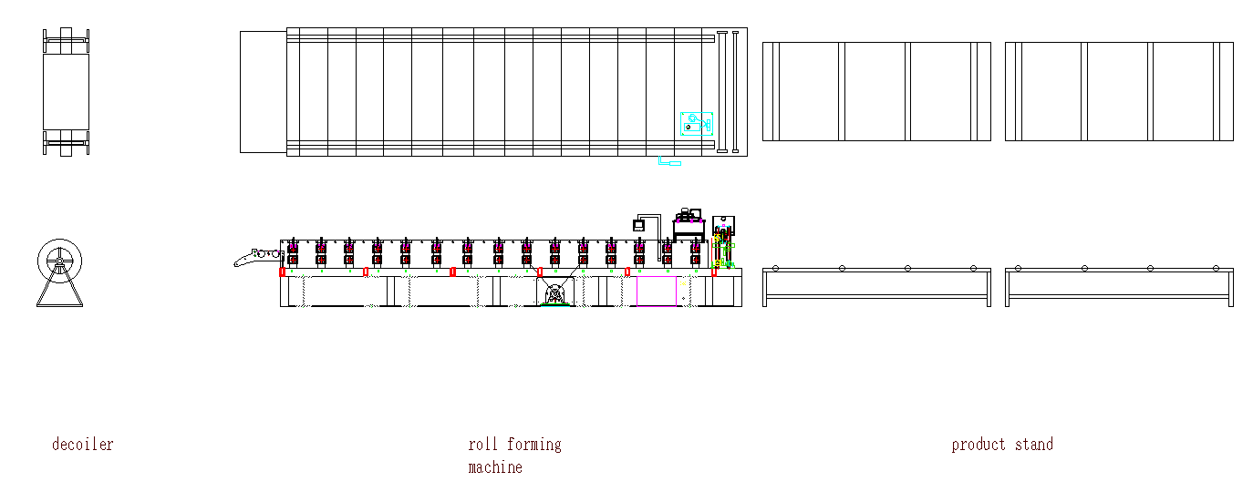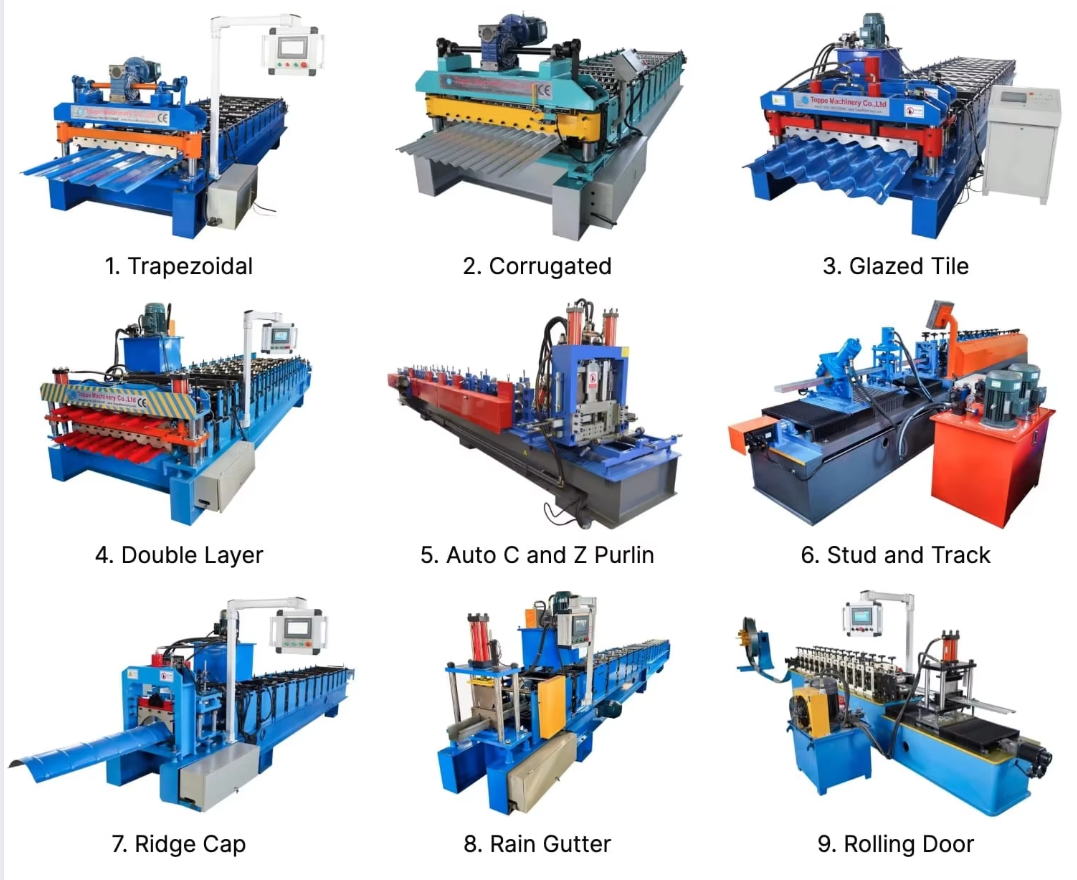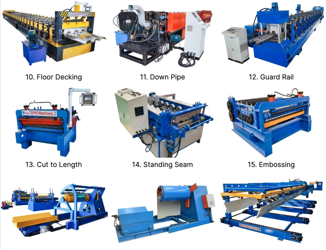 Roofing system roll forming machine is used in an extensive range of metal sheet profiles. It includes trapezoidal panel, corrugated panel, roof tile panel, step tile, glazed tiles, metal deck panel, standing seam panel, K span panel and ridge cap. Its products are widely used in roof and wall system in workshop construction and housing construction.